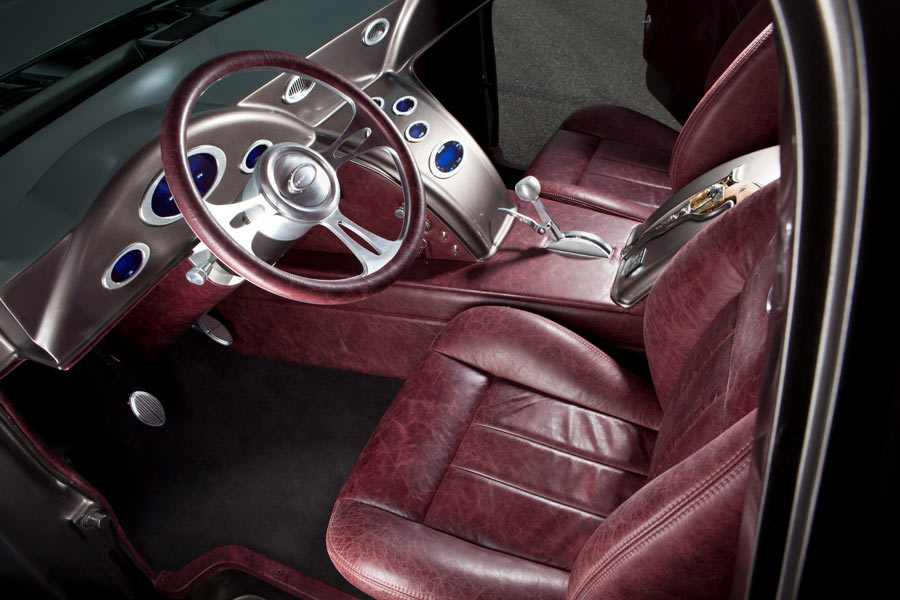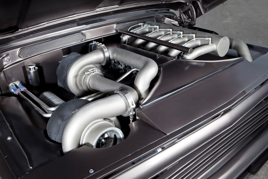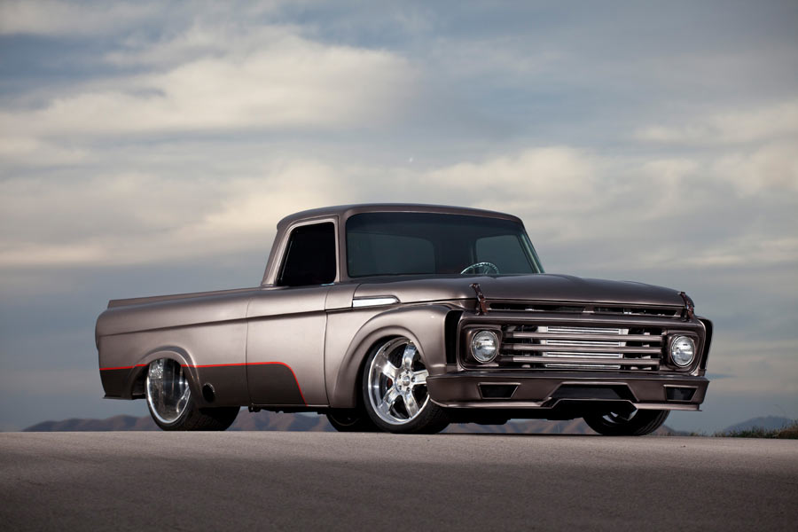 Introducing Django, a chopped Ford gone wild! With the windshield leaned back, fenders widened and moved up, custom hood, front and rear fender styling with a hand-fabricated grille and cowl. The bed has been completely restyled, wrapped and smoothed. Suicide doors, flush-mount glass, single-piece side glass and innovative custom hand-fabricated steel dash and console accents really take it to the next level. The interior is luxurious Italian distressed leather, all trimmed and filled with the latest Kicker audio components. 2015 Detroit Autorama is where "Django" debuted as a Ridler contender. While in Detroit it won Best Radical Truck, Outstanding Full Radical Hand-Built Truck, Outstanding Engineered and Outstanding Interior. That was followed by an abundance of awards at Goodguys events and the Salt Lake Autorama, where it won Outstanding Engineered and Utah's Top Ten. It then went on to be an invited feature car for the Hot Rod Power Tour, was a Barrett-Jackson Cup contender and brought home a Grand Marshall Award, a Celebrity's Choice and Best Special Interest award at Hot August Nights. The show year was completed with winning Best Engineered at the Johnny Martin Cup. It was featured in Hot Rod Magazine, Street Trucks, Classic Trucks, Truckin', Diesel Power and Diesel World, along with a long list of social media outlets, and was showcased on Velocity's live show at Hot August Nights powered by a monstrous horsepower and torque Cummins 5.9-liter 12-valve diesel. A Weaver Customs-designed stainless intake manifold supports a 13mm Bosch P7100 injection pump getting the goods from Borg Warner S400 and S500 turbos. For added kick, a Nitrous Express custom plumbed 500hp system, while spent gases dump through Steed Speed headers to custom 4" exhaust and Flowmaster mufflers then onto nasty 5" cutouts in the lower bedside panels. The engine bay is a work of art showcasing more fabrication with custom sheet metal panel work everywhere you look. Generating 1,000hp and 1,950 ft/lbs of torque at 3,400 rpm moving like a freight train through a fully manual 47RH. To lay down the power a narrowed 9" Ford rear was packed with 3.55 gears and hung in place by a custom ChromeMoly 4-link accented by RideTech double-adjustable coilovers. IFS was added along with a custom anti-sway bar. Massive 14" drilled and slotted Wilwoods bring it all to a halt. The rubber meeting the road is a low-profile Pirelli P-Zero wrapping a set of 20" front and 24" rear Boze Force wheels. Django is enhanced with meticulous metal fabrication, ingenuity, gritty stance and paint laid out like glass, which makes this all-steel truck truly one of a kind.