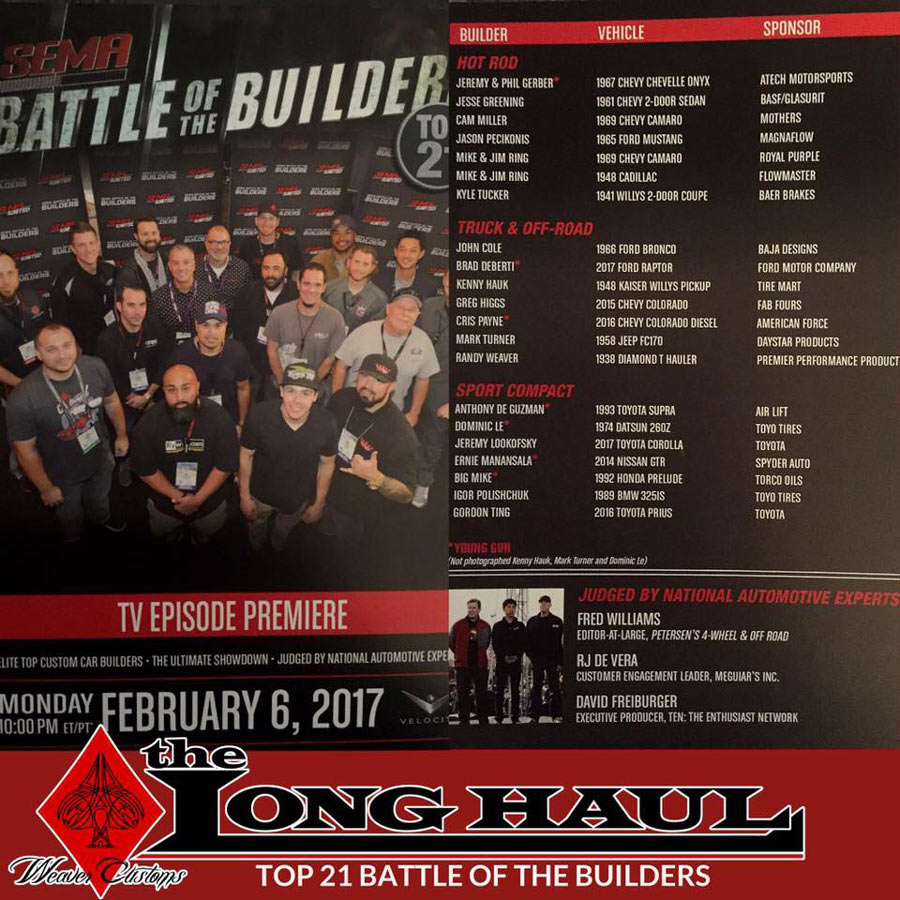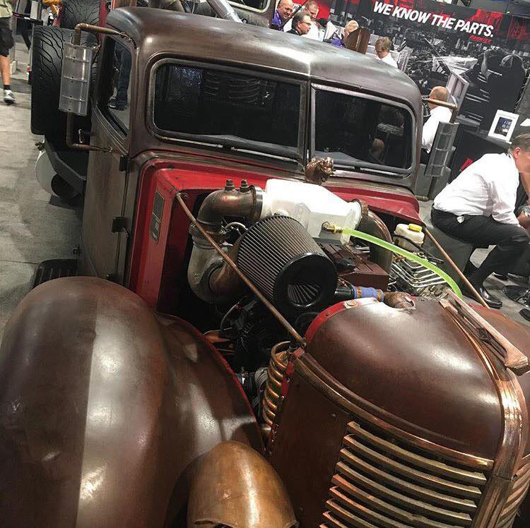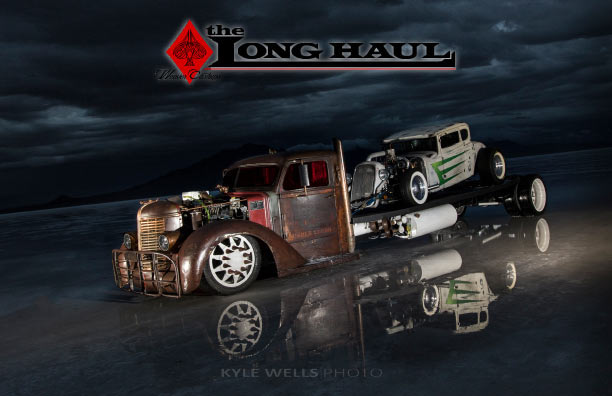 Let us introduce you to The Long Haul, a 1938 Diamond T full custom hauler. At nearly 30 feet long it definitely commands attention! This big rig features nearly 80 years of Mother Nature's patina along with patina copper accents by Ogden Chrome, hand fabricated triangulated 4 link, 5 inch stacks, full custom chassis and decking all riding on air. Motivated by a 650 HP Single Turbo P-Pumped 24 Valve Cummins Diesel. Lights: J.W. Speaker Corporation.