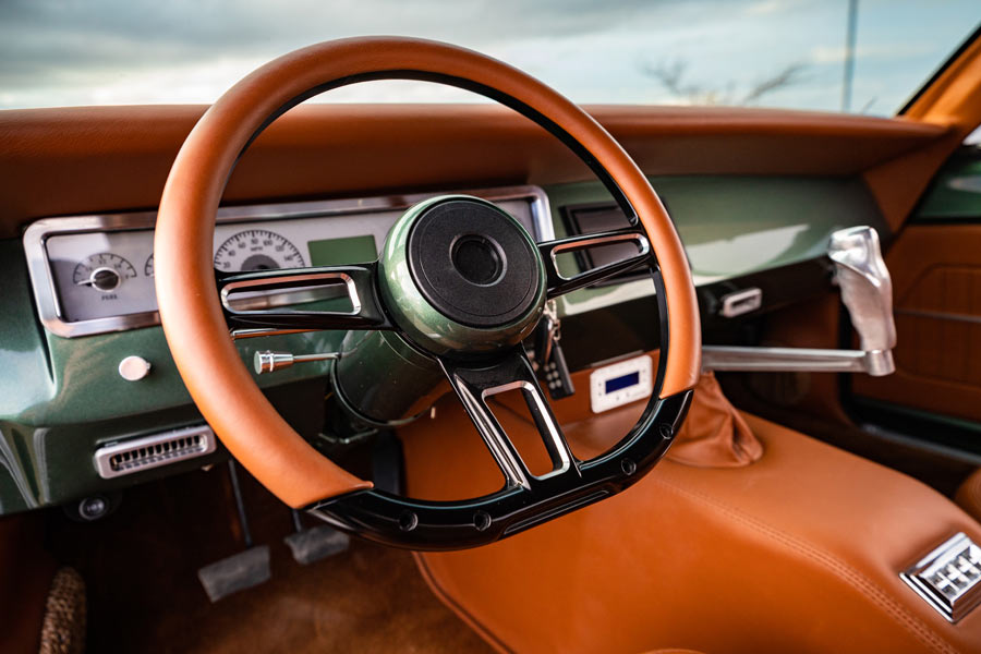 Interior: Custom dash featuring custom Dakota Digital VHX gauges. Kicker audio. Custom machined shifter. All trimmed in Hyde's Leather by JS Custom Interiors. One off machined accent vents and various pieces.