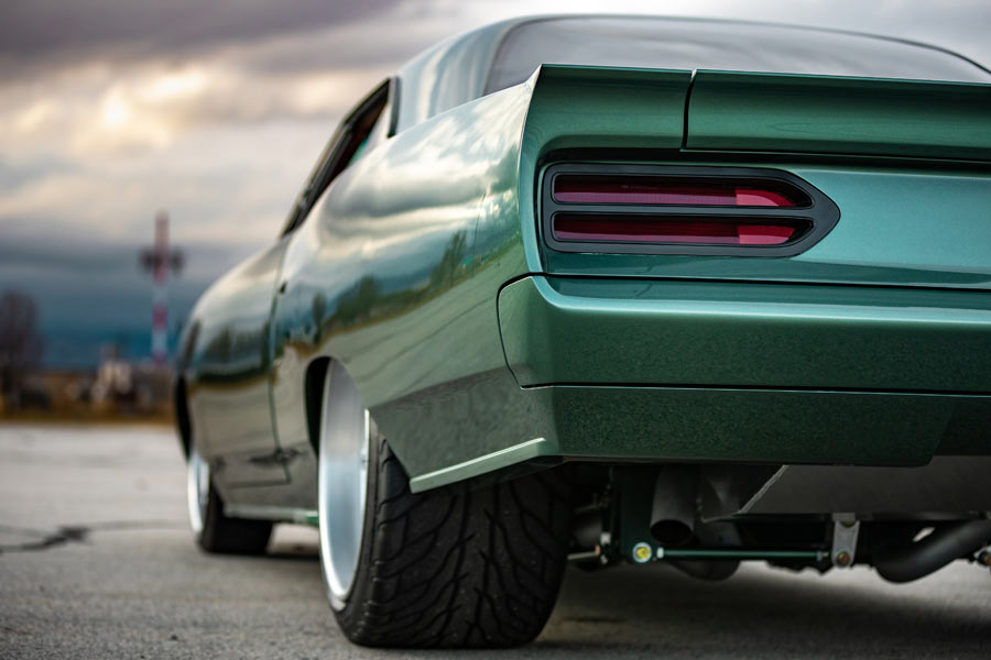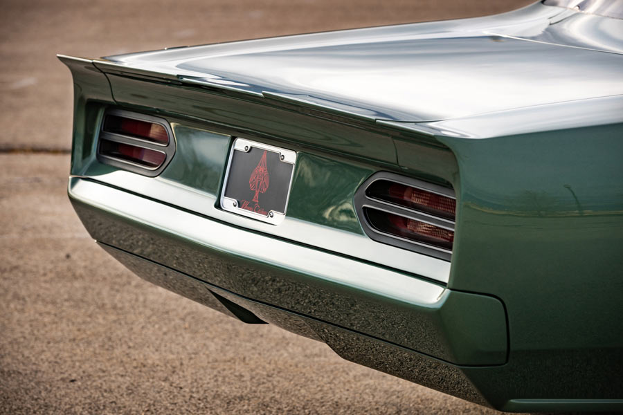 Body: All Steel, Front and rear restyled valances, hand fabbed rocker treatments, shaved and smoothed, flush mount glass, one-off hood, hand fabricated rear spoiler and tail extensions. Handmade bumpers. Live brake ducts, full custom engine bay.
