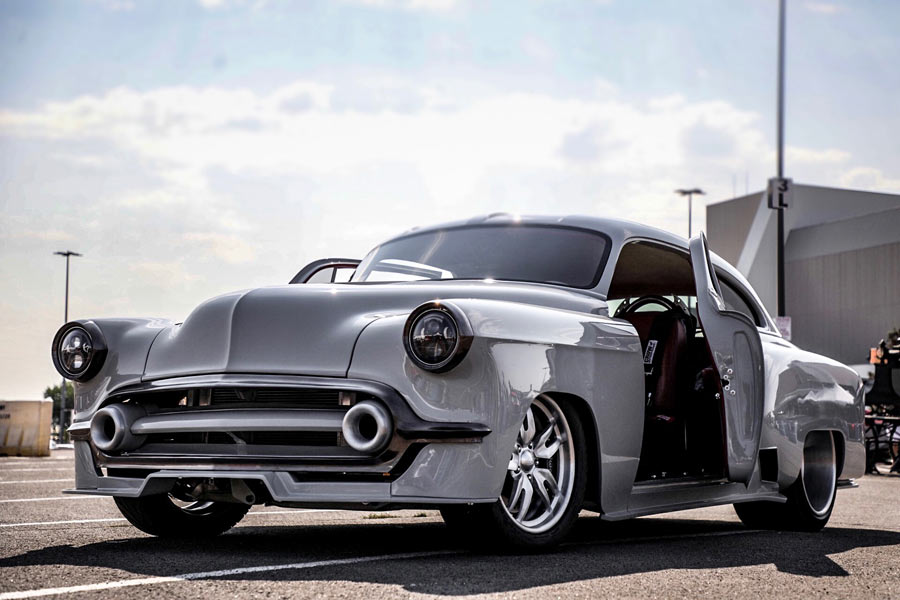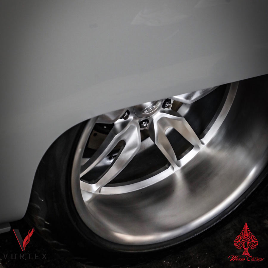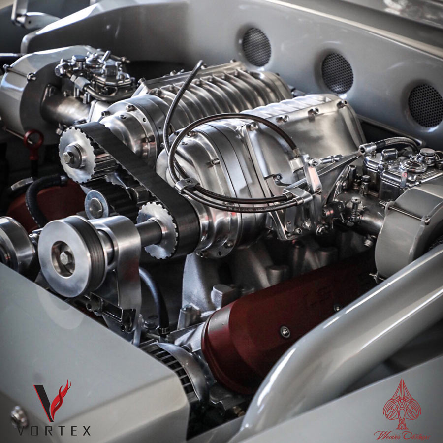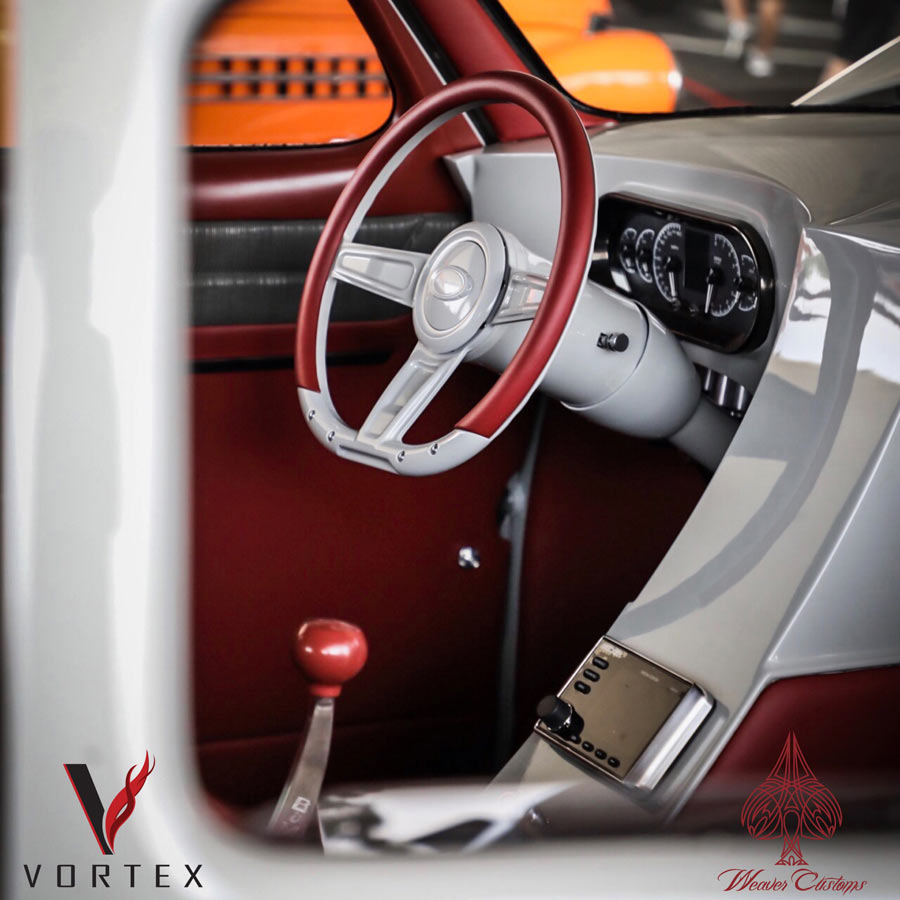 "Vortex" is a contemporary custom with a heavy performance edge by Weaver Customs. This 1953 Bel Air is packed with many custom all-steel body modifications, including a 1.75-inch chop, windshield leaned back 1.75 inches, wedge-sectioned hood, mohawk roof and decklid, belly pan, flush-mount glass, supercar-inspired front and rear valances, custom brake vents, rocker treatments and suicide doors. Covered in Axalta custom gray and with hand-brushed black chrome accents. Vortex features an LSX 376ci V8 engine with vintage twin-superchargers, TH350 3-speed automatic transmission with a 3500 stall, Art Morrison chassis, Boze wheels (20x15" rear, 18x8" front) and Mickey Thompson tires. The interior features Hyde's Italian leather trimmed by JS Custom Interiors. An all-steel hand-fabricated dash, waterfall console and hand-built roll bar hoops set Vortex's style. The interior is also accessorized with custom Dakota Digital gauges and Kicker audio. It has been honored as the 2019 World's Ultimate GM. Other accolades include LS Fest Grand Champion, Street Rodder Top 100, Goodguys awards, and multiple ISCA awards, including Best Engineered and Full Radical Hand Built. Vortex was undefeated at Hot August Nights 2018. Along with its show career, Vortex has been showcased as a feature vehicle for the Hot Rod Power Tour. It was also featured in the Adam's Polishes booth at SEMA 2018, where it was part of Battle of the Builders and named a Top Five vehicle at SEMA. Vortex has been seen in Street Rodder magazine and The Shop, along with many online articles.