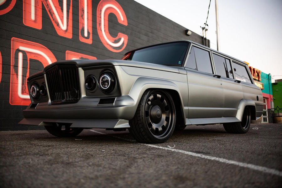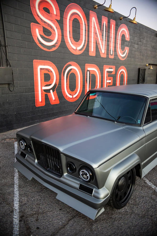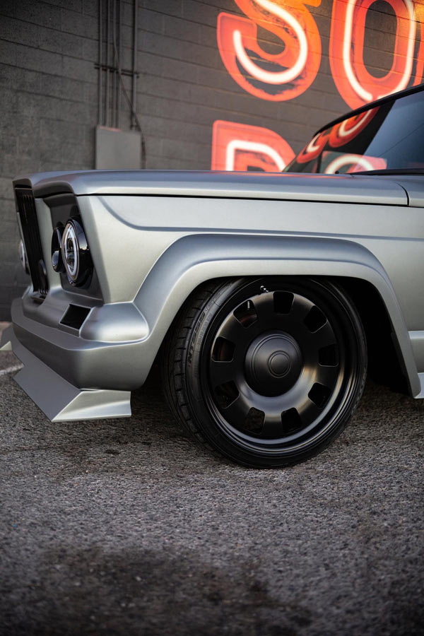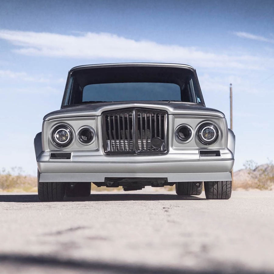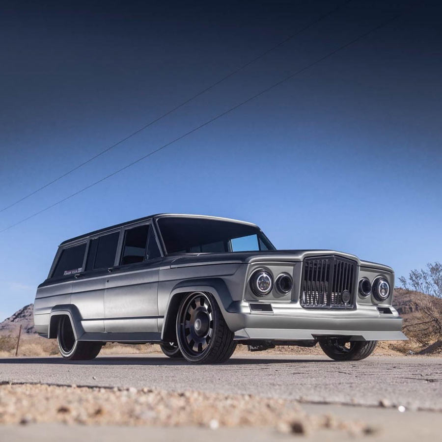 Finished in Pepper Grey and Nicknamed the "Chief," this 1975 Jeep Wagoneer built by Weaver Customs is powered by a twin-turbo 6-liter LS engine managed by a Holley Terminator X backed by 4L80E transmission. It rides on an independent front and 4-link rear end with RideTech adjustable coilovers on all four corners. Adding to its stance are 20-inch Detroit Steel Wheels wrapped in Nitto rubber. The custom chassis is coated in a gloss black. Weaver Customs utilized a 1965 Gladiator front end with inner pie pans transformed into turbo inlets. The full-custom interior is trimmed in Hydes leather featuring Dakota Digital gauges, Pioneer Audio and Vintage Air climate control. The "Chief" debuted on Hot Rod Magazine's Power Tour 2021 where it proved its street ability. It was then showcased in POR-15's booth at SEMA 2021. This Jeep is also a Goodguys award-winner.